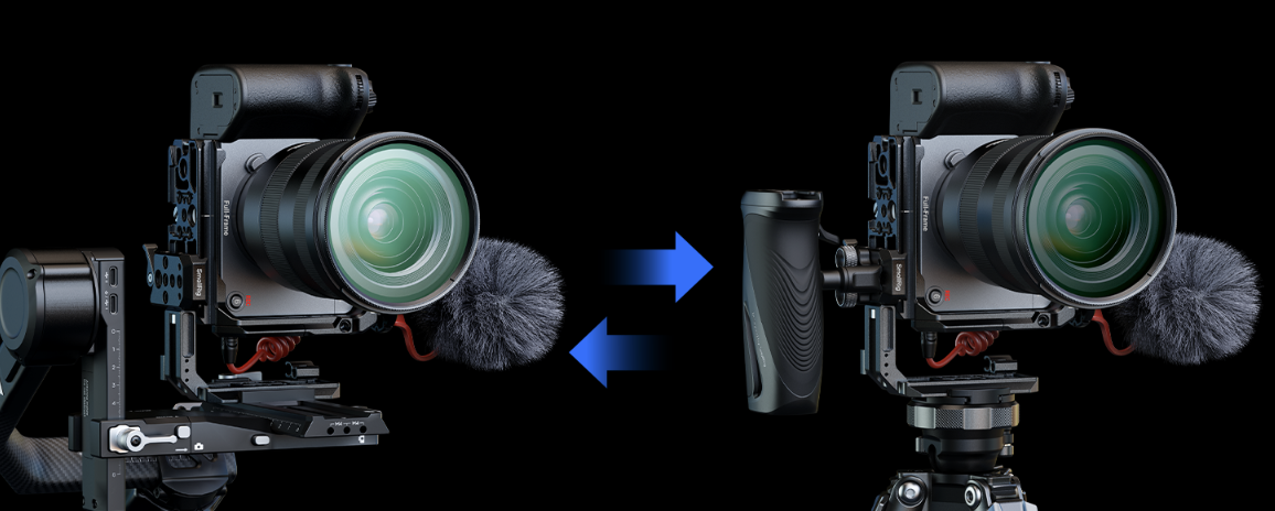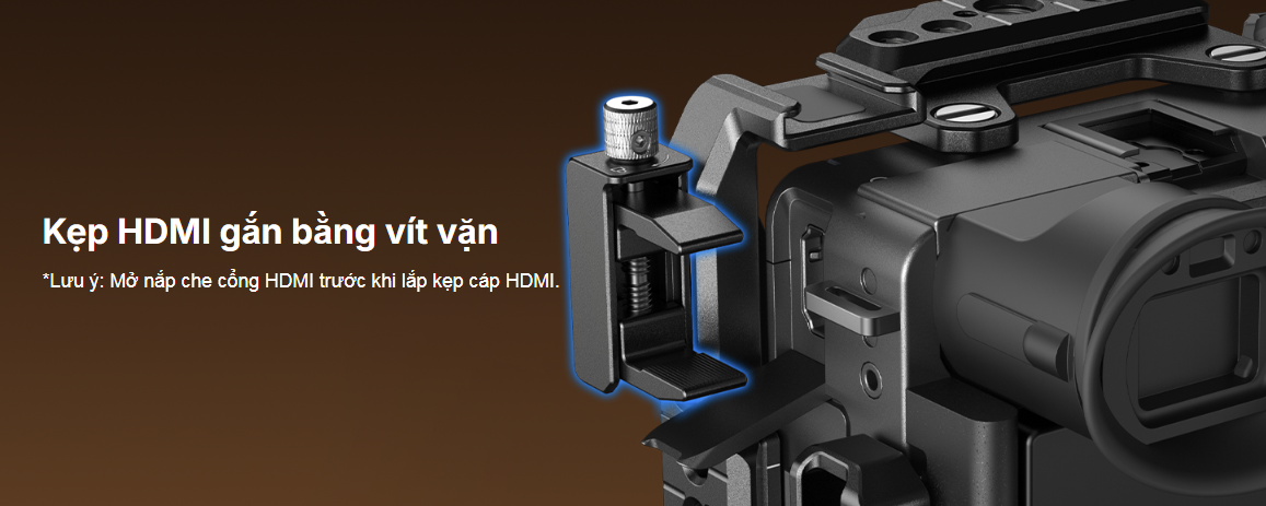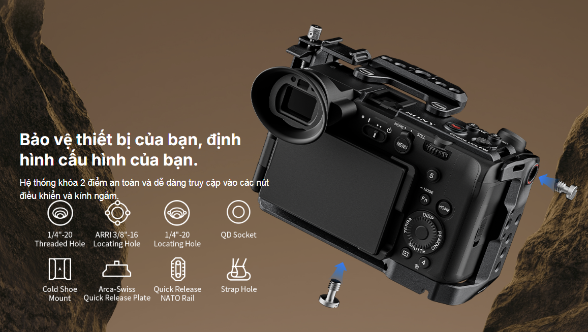 Tấm đế trên dạng mô-đun có thể dễ dàng tháo rời thông qua thanh ray NATO, tương thích với tay cầm XLR phía trên của Sony hoặc tay cầm xoay phía trên của SmallRig (ID 4152 ) mà không gây cản trở kính ngắm điện tử (EVF). Khung bảo vệ tích hợp nhiều điểm gắn kết, bao gồm các lỗ ren 1/4"-20, lỗ định vị ARRI 3/8"-16 và thanh ray NATO “HawkLock” để gắn nhanh các phụ kiện như tay cầm bên (ID 4485 ) và tay cầm phía trên (ID 4483 ). Ngàm gắn phụ kiện cho phép gắn các thiết bị như DJI Mic 2 hoặc đèn LED, trong khi ổ cắm QD ở đế cho phép gắn dây đeo vai để tăng tính di động. Đế cũng được trang bị cờ lê lục giác từ tính, giúp lắp ráp và tháo rời nhanh chóng.