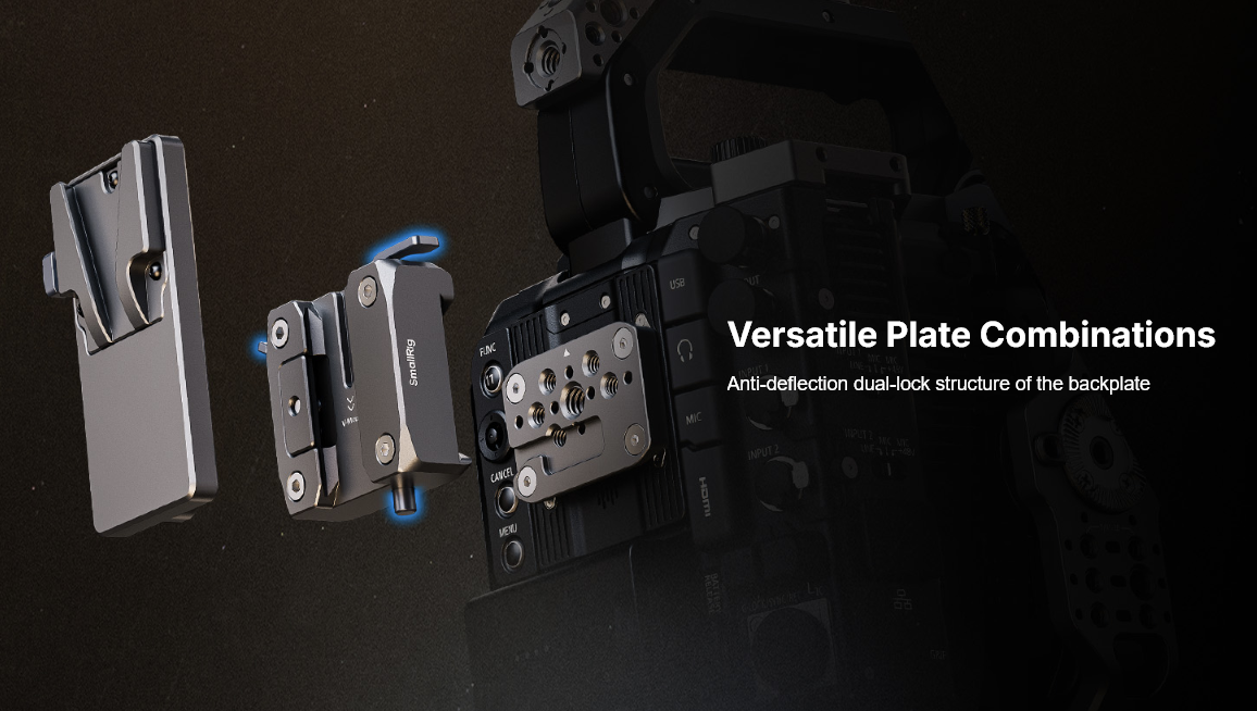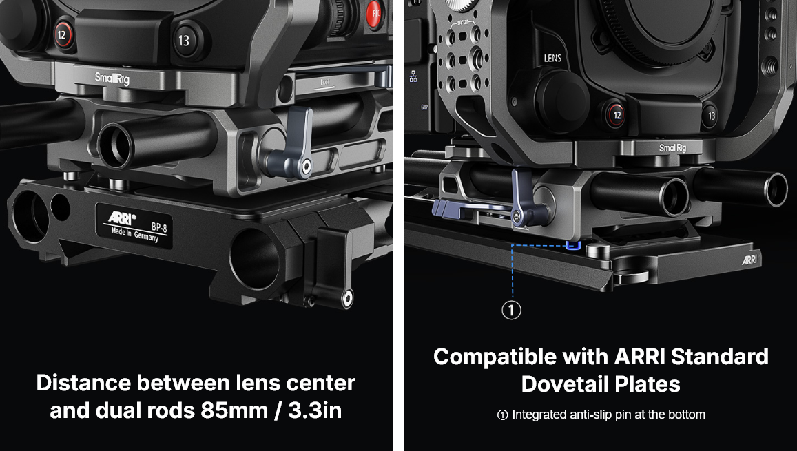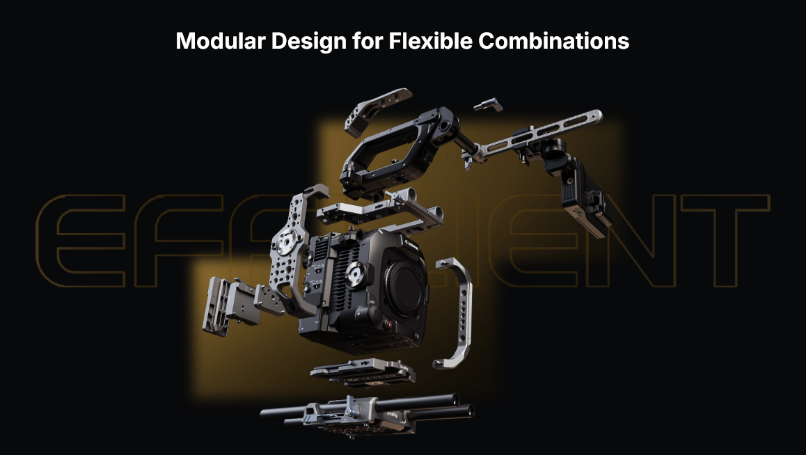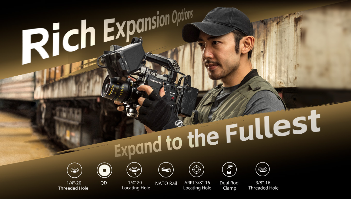 Thiết kế dạng mô-đun của bộ khung (tấm trên, tấm bên và tấm đế) cho phép thích ứng liền mạch với nhiều tình huống quay phim khác nhau. Bộ khung có nhiều giao diện gắn kết tích hợp như lỗ ren 1/4"-20, lỗ định vị ARRI, lỗ định vị 1/4"-20, lỗ ren 3/8"-16, kẹp thanh kép, giao diện QD, ray NATO, ngàm cold shoe, vòng xoay ARRI, và nhiều hơn nữa. Kết hợp với chân máy (ID 4463 ), nó giúp chuyển đổi nhanh chóng từ hướng ngang sang hướng dọc. Bộ khung cũng có thể gắn dây đeo vai QD (ID 4118 ), giúp dễ dàng mang theo.