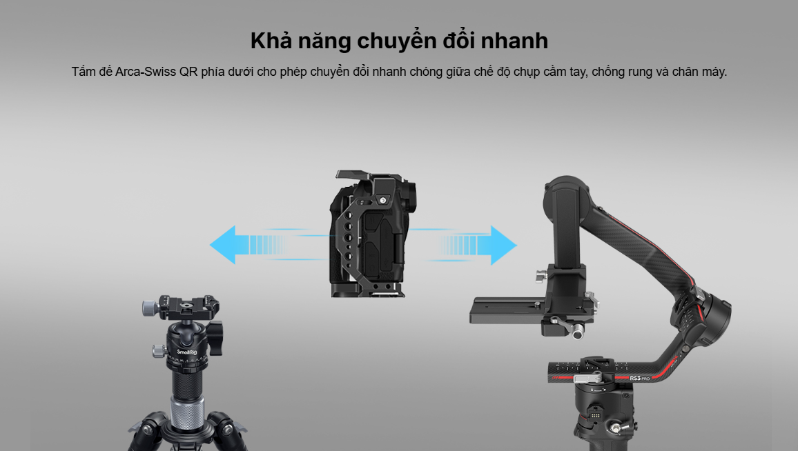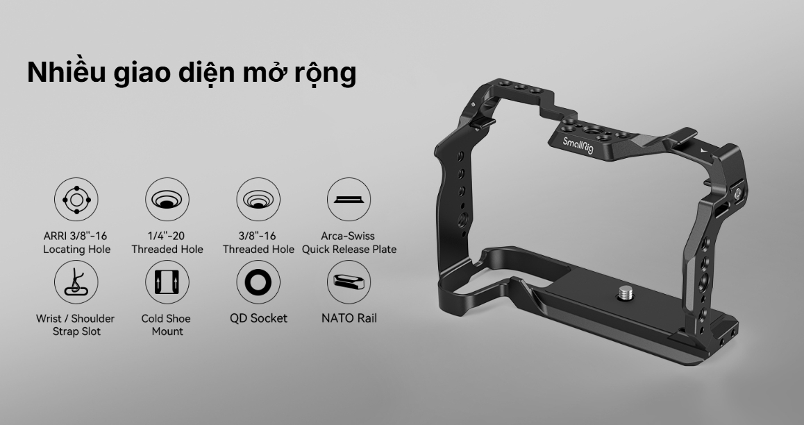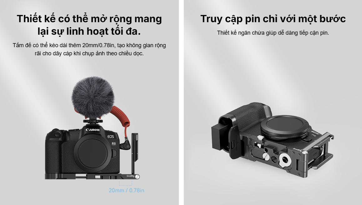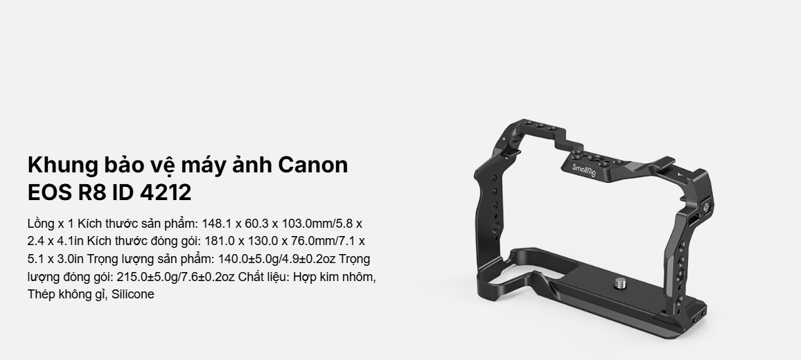 Khung bảo vệ SmallRig dành cho Canon EOS R8 4212 được thiết kế để bảo vệ máy ảnh và gắn các phụ kiện. Khung khóa máy ảnh bằng một vít 1/4"-20 ở đáy và hai bộ chuyển đổi khóa bên hông, đi kèm với các miếng đệm cao su giúp chống trầy xước và cho phép truy cập đầy đủ vào các nút, khe cắm thẻ, màn hình lật và cửa pin. Trong số các ngàm phụ kiện, các lỗ ren 1/4"-20, lỗ ren 3/8"-16 và lỗ định vị ARRI 3/8"-16 hỗ trợ Tay cầm trên 3765 , Tay cầm bên 2093C , Giá đỡ màn hình 2903B và Cần xoay đa năng 3875 ; ngàm cold shoe phía trên gắn được Micro 3468 , Đèn video LED 3286B ; và thanh ray NATO bên trái phù hợp với Tay cầm bên xoay 3260 & 3813 . Ngoài ra, còn có ổ cắm QD để gắn khóa dây đeo vai tháo nhanh và tấm đế tháo nhanh Arca-Swiss ở phía dưới để gắn chân máy kiểu Arca hoặc gimbal DJI RS 2 / RSC 2 / RS 3 / RS 3 Pro, cho phép chuyển đổi nhanh chóng giữa chế độ chụp bằng gimbal, cầm tay và gắn chân máy. Một tua vít được kèm theo để dễ dàng lắp ráp và tháo rời.