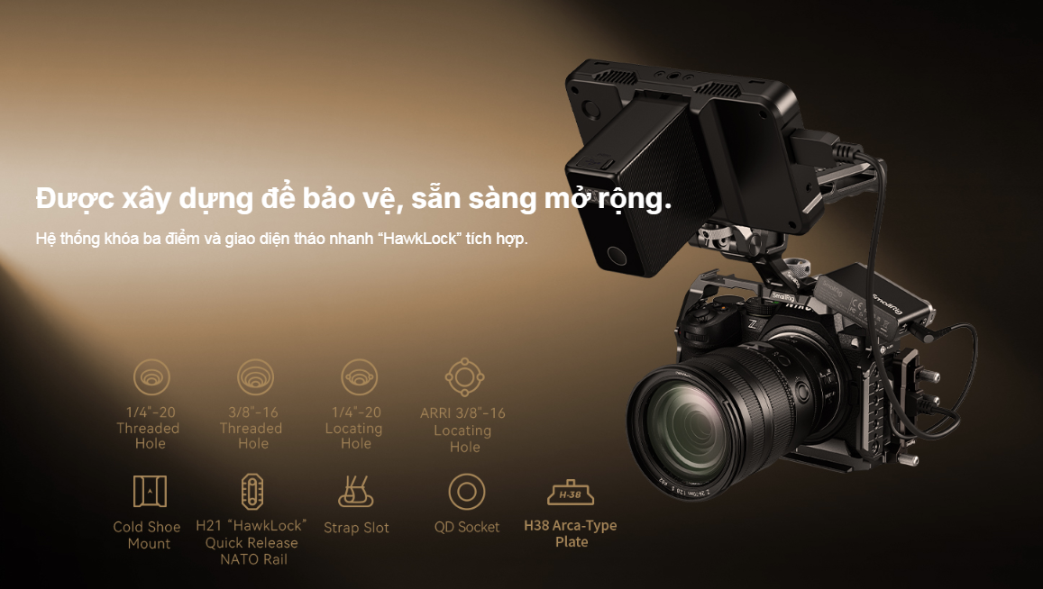 Khung bảo vệ SmallRig dành cho Nikon Z5 / Z5II / Z6 / Z6II / Z7 / Z7II 5257 được thiết kế để bảo vệ toàn diện máy ảnh đồng thời cung cấp các giao diện mở rộng đa năng. Khung bảo vệ này có hệ thống khóa ba điểm, sử dụng vít 1/4"-20 ở đáy và các khối định vị hai bên để cố định máy ảnh và ngăn ngừa biến dạng, trong khi các miếng đệm tích hợp bảo vệ máy ảnh khỏi trầy xước. Điều quan trọng là, khung bảo vệ không gây cản trở các nút bấm, cổng kết nối, màn hình lật hoặc ngăn chứa pin của máy ảnh.