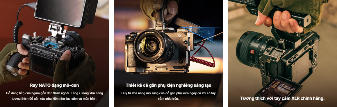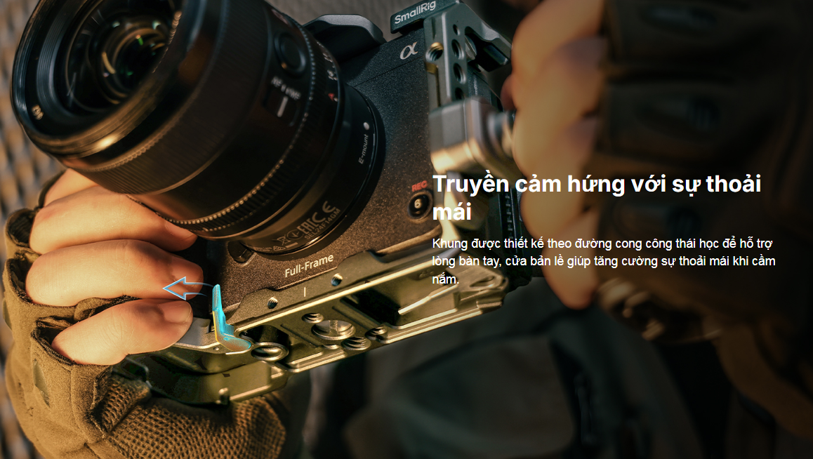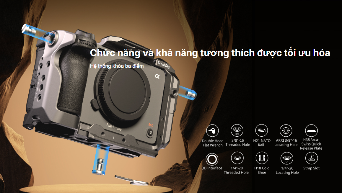 Khung bảo vệ SmallRig dành cho Sony FX30 / FX3 4183B được thiết kế để bảo vệ máy ảnh và cung cấp các điểm gắn phụ kiện. Khung bảo vệ dạng mô-đun bao gồm một thanh ray NATO và một khung hình chữ U. Thanh ray NATO được cố định ở phía trên bằng hai vít 1/4"-20 và có thể tháo rời để lắp đặt tay cầm XLR phía trên nguyên bản; khung hình chữ U được cố định bằng các vít 1/4"-20 ở cả hai bên và ở phía dưới để tránh bị xoắn, với một lớp đệm chống trầy xước. Tại cửa pin có một tay khớp bản lề phù hợp với đường cong của máy ảnh để cải thiện trải nghiệm cầm nắm cho ngón tay út. Một kẹp cáp HDMI chuyên dụng bảo vệ các giao diện để đảm bảo truyền tín hiệu ổn định. Trong số các điểm gắn phụ kiện đa dạng, các lỗ 1/4"-20 hỗ trợ Magic Arm 2070 ; các lỗ định vị ARRI 3/8"-16 kết nối Tay cầm phía trên 2165C hoặc Giá đỡ màn hình 2903B ; thanh ray NATO phía trên hỗ trợ Tay cầm phía trên 3322 , và thanh ray bên trái hỗ trợ Tay cầm bên 2187B ; Các lỗ định vị 1/4"-20 ở góc trên bên trái và bên trái dùng để gắn kẹp thanh 3598 cho hệ thống lấy nét tự động; hai lỗ 1/4"-20 ở bên phải cho phép gắn chắc chắn vào tấm đế tháo nhanh để chụp ảnh dọc; ngàm gắn phụ kiện (cold shoe) hỗ trợ micro, đèn LED; và cổng QD ở phía dưới phù hợp với dây đeo QD. Tấm đế tháo nhanh Arca-Swiss ở phía dưới có thể gắn trực tiếp DJI RS 2 / RSC 2 / RS 3 / RS 3 Pro hoặc tấm đế tháo nhanh (đệm tăng chiều cao) cho gimbal DJI RS 2 / RSC 2 và tấm đế tháo nhanh Arca-Type 3154. Cả hai bên và phía dưới đều có lỗ để gắn dây đeo tay 3848 và dây đeo vai PSC2428 . Một cờ lê từ tính cũng được bao gồm để dễ dàng lắp ráp và tháo rời.