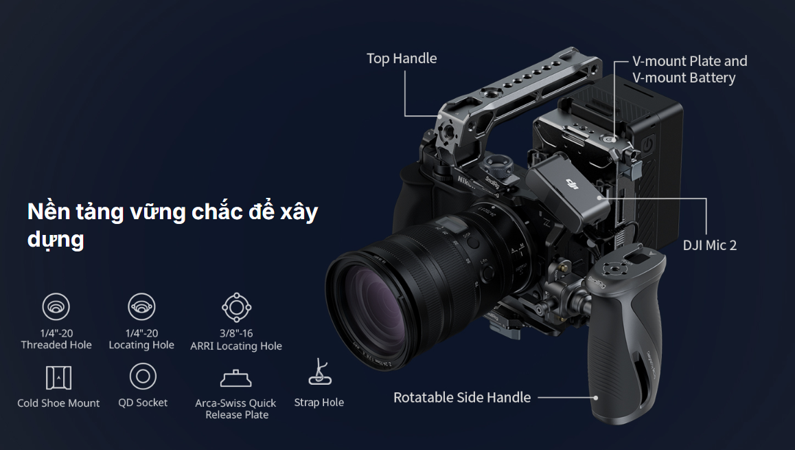 Khung bảo vệ này cung cấp nhiều tùy chọn mở rộng, bao gồm nhiều lỗ ren 1/4"-20 và các lỗ định vị để gắn các phụ kiện như tay cầm bên (ID 5532 ) hoặc tay đỡ đa năng (ID 5308 , 4900 ). Nó cũng có các lỗ định vị ARRI 3/8"-16 để gắn giá đỡ màn hình (ID 2903B ) hoặc tay cầm phía trên (ID 5252 , 3765 ). Các ngàm gắn phụ kiện tích hợp cho phép gắn micro (tương thích với DJI MIC 2) hoặc đèn (ID 4660 ), trong khi ổ cắm QD phía dưới hỗ trợ dây đeo vai QD (ID 4118B ). Ngoài ra, các khe cắm dây đeo phù hợp với dây đeo cổ tay (ID 3848 ) hoặc dây đeo vai (ID 4882 , 5208 ).