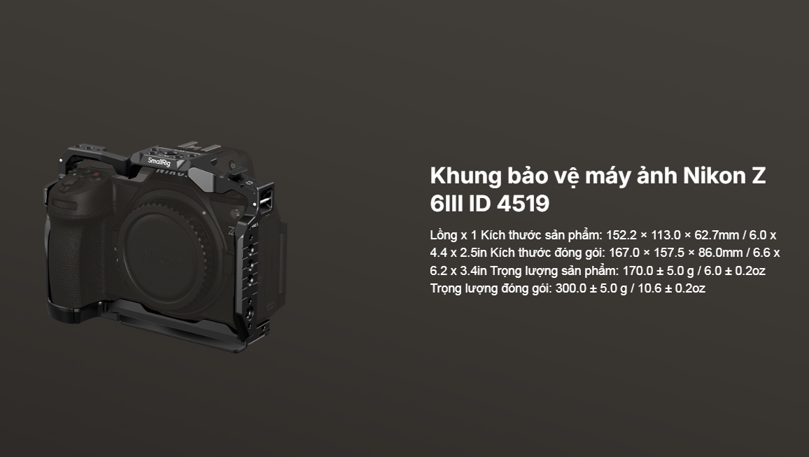 Khung bảo vệ máy ảnh SmallRig dành cho Nikon Z 6III 4519 được thiết kế để cung cấp lớp vỏ bảo vệ và các tùy chọn mở rộng linh hoạt cho máy ảnh. Khung bảo vệ cố định máy ảnh chắc chắn bằng vít 1/4"-20 ở phía dưới và hai vít M2.5 ở hai bên, trong khi các miếng đệm tích hợp giúp ngăn ngừa trầy xước. Nó cung cấp khả năng truy cập không bị cản trở vào tất cả các giao diện máy ảnh, khe cắm thẻ, màn hình lật và cửa pin. Khung bảo vệ có nhiều tùy chọn mở rộng, chẳng hạn như lỗ ren 1/4"-20, lỗ ren 3/8"-16 và lỗ định vị ARRI, tương thích với tay cầm bên (ID 2093 , 4015 ), tay cầm trên (ID 3765 , 2165C ), giá đỡ màn hình (ID 2903 , 2904 ), chân máy (ID 4465 , 3989 ), giá đỡ pin dự phòng (ID 2336 ) và tấm pin mini V-mount (ID 2987 ). Các lỗ định vị 1/4"-20 tích hợp ở hai bên cho phép gắn các phụ kiện như kẹp thanh đơn (ID 3598 ), magic Cánh tay (ID 3873 ) và tay cầm bên (ID 4346 ). Tích hợp ray NATO ở bên trái để gắn và tháo tay cầm bên nhanh chóng (ID 3847 , 4017 ). Các ngàm gắn phụ kiện tích hợp hỗ trợ micro, đèn LED quay phim và nhiều thiết bị khác. Tích hợp khe cắm dây đeo cổ tay để sử dụng với dây đeo cổ tay (ID 3848 , 2456 ), cũng như giao diện QD tích hợp tương thích với dây đeo vai (ID 4118 ). Tấm đế tháo nhanh Arca-Swiss ở phía dưới tương thích với chân máy kiểu Arca (ID 4060 , 4353 ) và gimbal DJI RS 2 / RSC 2 / RS 3 / RS 3 Pro/ RS 4 / RS 4 Pro, cho phép chuyển đổi dễ dàng giữa gimbal, quay phim cầm tay và quay phim trên chân máy. Ngoài ra, cờ lê phẳng hai đầu ở đế giúp đơn giản hóa việc lắp ráp và tháo rời.