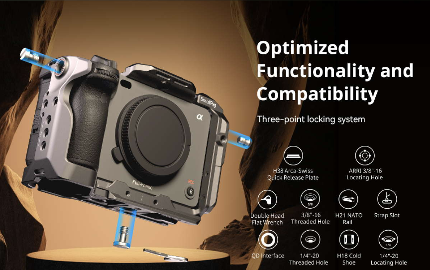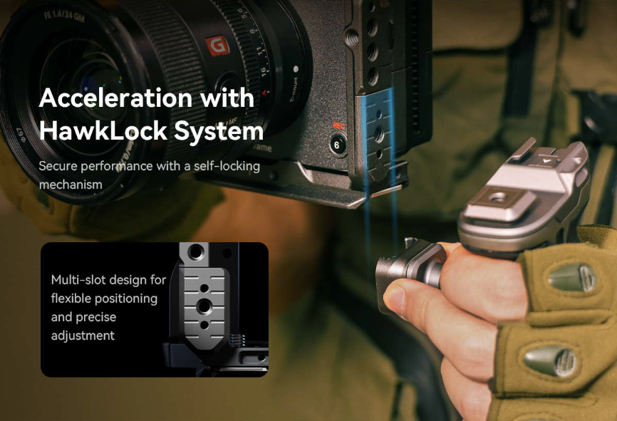 Bộ khung bảo vệ máy ảnh SmallRig "HawkLock" tháo lắp nhanh cao cấp dành cho Sony FX3 / FX30 (Phiên bản nâng cao) 4771 được thiết kế để bảo vệ máy ảnh và cung cấp các điểm gắn phụ kiện, từ đó cải thiện trải nghiệm chụp ảnh. Tay cầm mở rộng XLR được thiết kế công thái học để tăng cường độ bám và sức mạnh của tay cầm XLR phía trên ban đầu, giúp dễ dàng mở rộng các phụ kiện. Kẹp cáp HDMI chuyên dụng bảo vệ các giao diện để đảm bảo truyền tín hiệu ổn định. Dây đeo tay giúp tăng độ ổn định và an toàn. Cấu trúc tháo lắp nhanh được cấp bằng sáng chế (có tên là HawkLock) bao gồm đế gắn phụ kiện (cold shoe), ray NATO và tấm Arca-Swiss. Nó được sử dụng kết hợp với các phụ kiện tương thích HawkLock, chẳng hạn như Magic Arm 4490 , tay cầm bên 4485 , kẹp Arca-Swiss 4486 , v.v., để đạt được khả năng trượt vào mượt mà và tự khóa, cải thiện hiệu quả tháo lắp. Đồng thời, nó tương thích với đế gắn phụ kiện truyền thống, kẹp NATO và các phụ kiện tương thích Arca-Swiss Clamp. Ngoài ra, khung máy còn tích hợp các lỗ ren 1/4“-20, lỗ định vị ARRI 3/8”-16, lỗ định vị 1/4”-20, ổ cắm QD và khe đeo dây, và có thể mở rộng với các phụ kiện như tay đỡ đa năng 3873 , kẹp thanh 3598 , dây đeo vai QD và dây đeo vai PSC2428 để tạo ra những sản phẩm chuyên nghiệp. Một cờ lê từ tính cũng được bao gồm để dễ dàng lắp ráp và tháo rời.