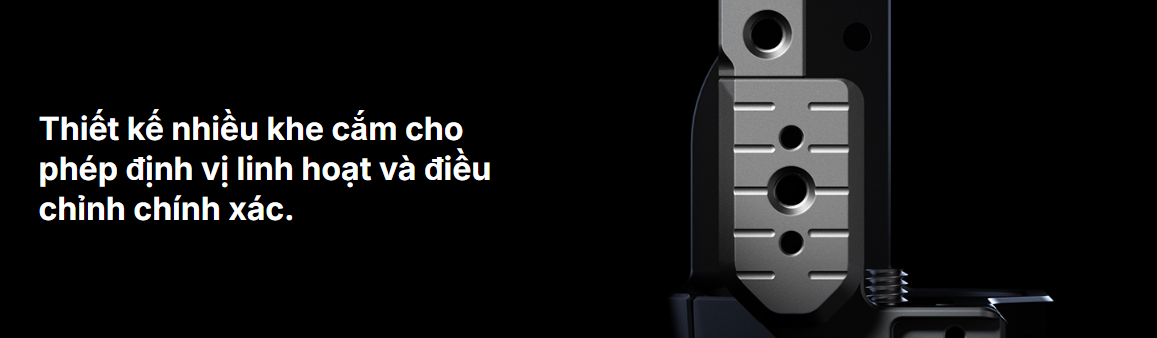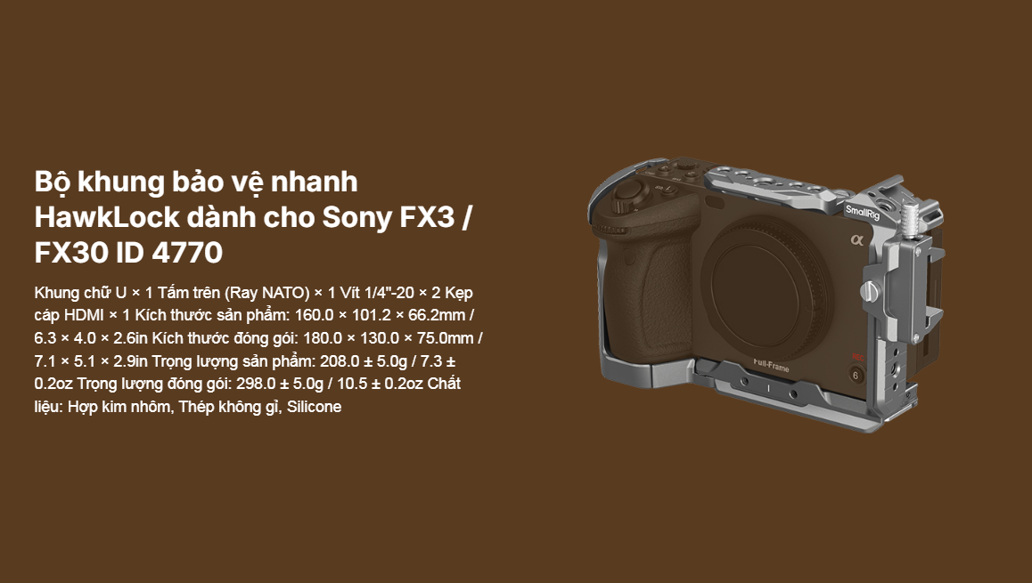Bộ khung bảo vệ nhanh SmallRig "HawkLock" dành cho Sony FX3 / FX30 4770 được thiết kế để bảo vệ máy ảnh và cung cấp các điểm gắn phụ kiện. Khung bảo vệ dạng mô-đun bao gồm một thanh ray NATO và một khung hình chữ U. Thanh ray NATO được cố định ở phía trên bằng hai vít 1/4"-20 và có thể tháo rời để lắp tay cầm XLR phía trên nguyên bản; khung hình chữ U được cố định bằng các vít 1/4"-20 ở cả hai bên và ở phía dưới để tránh bị xoắn, đồng thời có lớp đệm chống trầy xước. Tại cửa pin, một tay khớp nối phù hợp với đường cong của máy ảnh để cải thiện trải nghiệm cầm nắm cho ngón tay út. Kẹp cáp HDMI chuyên dụng bảo vệ các giao diện để đảm bảo truyền tín hiệu ổn định. Cấu trúc tháo lắp nhanh được cấp bằng sáng chế (có tên là HawkLock) bao gồm đế gắn phụ kiện, thanh ray NATO và tấm Arca-Swiss. Sản phẩm được sử dụng kết hợp với các phụ kiện tương thích với hệ sinh thái HawkLock, chẳng hạn như Tay cầm trên 4483 , Tay cầm bên 4485 , Kẹp Arca-Swiss 4486 , v.v., để đạt được khả năng trượt vào mượt mà và tự khóa, giúp nâng cao hiệu quả tháo lắp. Đồng thời, nó tương thích với đế gắn phụ kiện truyền thống, Kẹp NATO và các phụ kiện tương thích với hệ sinh thái Kẹp Arca-Swiss. Ngoài ra, khung máy còn tích hợp các lỗ ren 1/4“-20, Lỗ định vị ARRI 3/8”-16, lỗ định vị 1/4”-20, ổ cắm QD và khe cắm dây đeo, và có thể được mở rộng với các phụ kiện như Tay đỡ đa năng 3873 , Tay cầm trên 2165C , Kẹp thanh 3598 , Dây đeo vai QD, Dây đeo tay 3848 và Dây đeo vai PSC2428 để tạo ra các sản phẩm chuyên nghiệp. Một cờ lê từ tính cũng được bao gồm để dễ dàng lắp ráp và tháo rời.