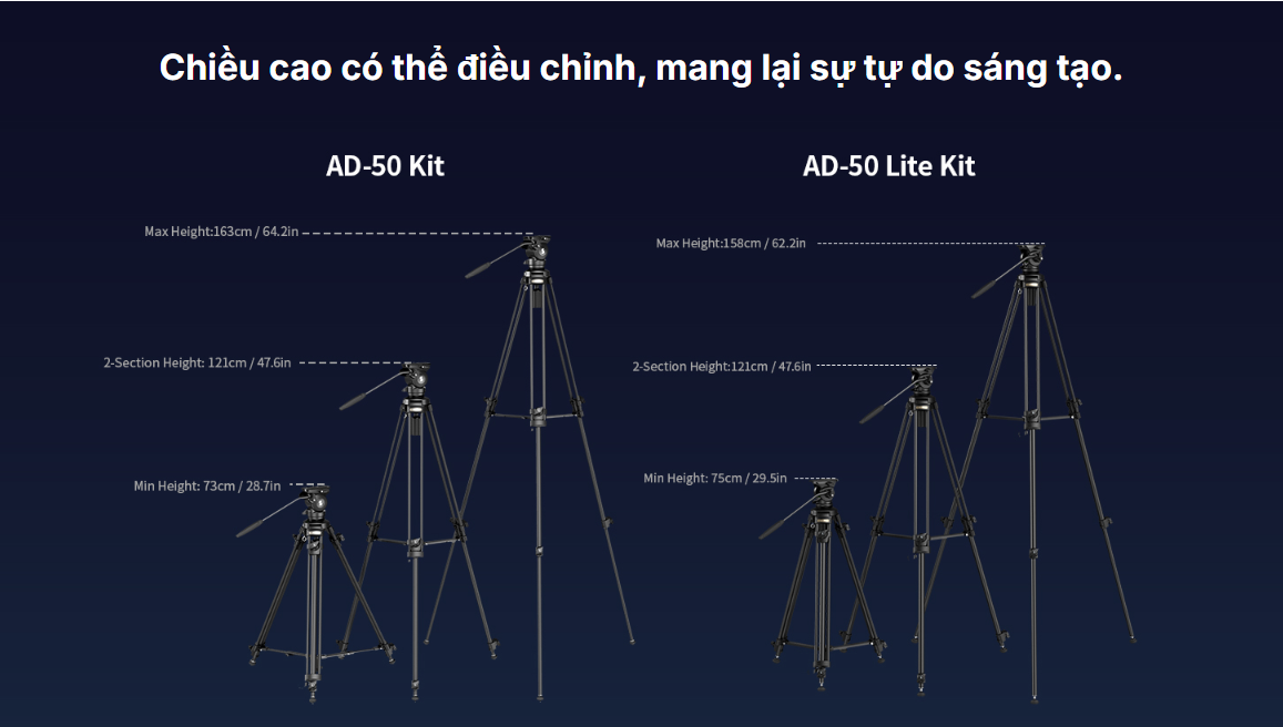 Bộ chân máy quay phim nhẹ SmallRig AD-50 Lite 4684 là bộ chân máy quay phim nhẹ giúp việc quay phim dễ dàng hơn. Chân máy được làm bằng hợp kim nhôm, bố trí theo kiểu 2-1-1, mang lại hiệu suất ổn định và giảm trọng lượng, trọng lượng của bộ sản phẩm chỉ 2,8kg (6,2lb); phù hợp với việc di chuyển linh hoạt tại hiện trường quay phim; chân máy được thiết kế dây nâng nhanh ở giữa, bằng cách kết nối vòng kéo ở giữa và vòng kéo ở đáy đế, bạn có thể nhanh chóng nâng vòng kéo ở giữa lên, giảm không gian chiếm dụng của chân máy; chân máy được khóa bằng núm vặn, phạm vi chiều cao làm việc của hệ thống là 75~158cm (29,5~62,2in), chiều dài khi gấp gọn là 79cm (31,1in). Đầu quay phim có hệ thống giảm chấn cố định và hệ thống đối trọng cố định để cung cấp chuyển động xoay và nghiêng mượt mà cho máy ảnh; khả năng chịu tải của đầu quay phim là 5kg (11lb), đáp ứng nhu cầu sử dụng của máy ảnh nhỏ. Chân máy được trang bị thiết kế chân đế có gai chống xê dịch, và chế độ chân đế có thể được chuyển đổi thông qua các miếng đệm xoay, đáp ứng nhu cầu của các tình huống khác nhau. Chân máy có lỗ ren chống lệch 1/4"-20 để kết nối các thiết bị ngoại vi như tay đỡ đa năng, micro, màn hình hoặc bộ truyền hình ảnh.