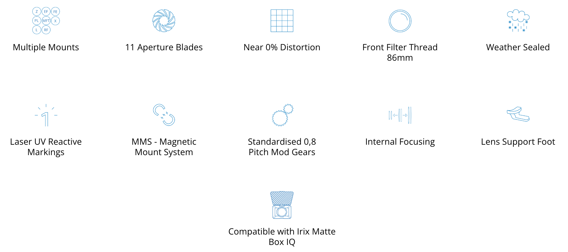 Tất cả các ống kính Irix Cine (ngoại trừ ống kính Irix 11mm T4.3) đều có Hệ thống ngàm từ tính (MMS) tương thích với Irix Edge (MMS), bộ lọc Vari ND và Loa che ống kính Irix MMS.