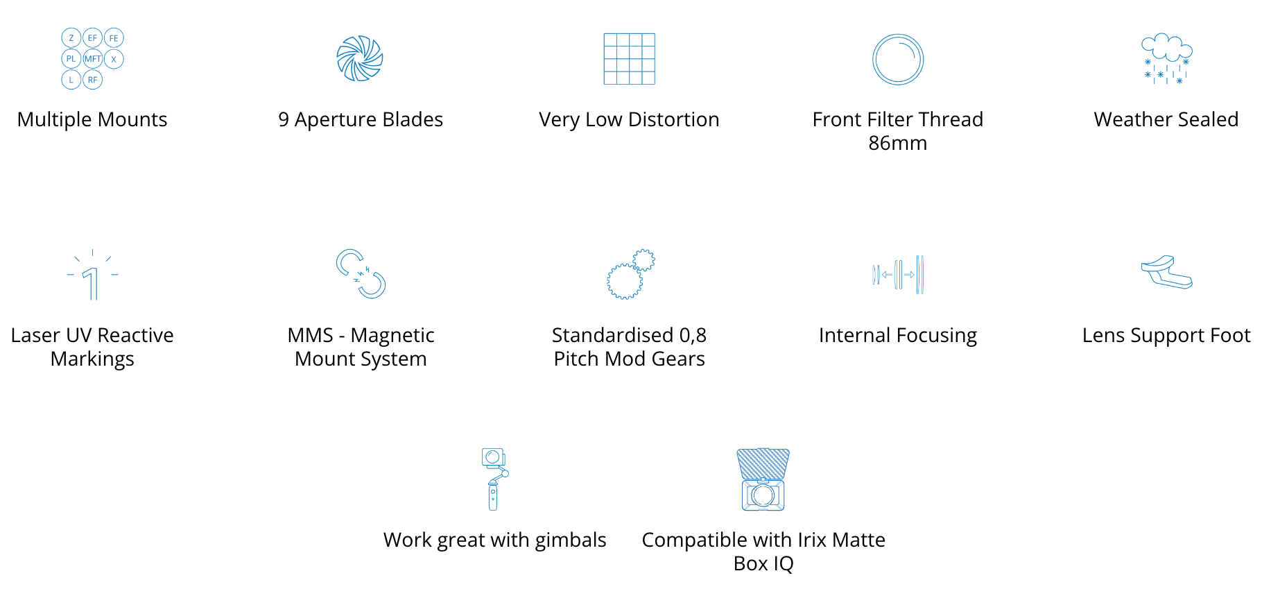 Tất cả các ống kính phim Irix đều có kích thước và trọng lượng rất giống nhau, cho phép thay đổi ống kính nhanh chóng và dễ dàng mà không cần phải thay đổi toàn bộ thiết bị còn lại, cũng như hoạt động hiệu quả hoàn toàn với các thiết bị ổn định hình ảnh (gimbal) phổ biến trên thị trường hiện nay như Zhiyun, DJI.