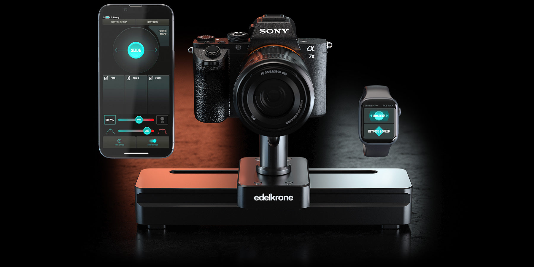 Lý tưởng để sử dụng với nhiều loại máy ảnh, bao gồm máy ảnh DSLR, máy ảnh không gương lật và máy ảnh kiểu cine nhỏ hơn, SliderONE v3 có thể được điều khiển từ điện thoại, máy tính bảng, đồng hồ hoặc máy tính Mac có bộ xử lý M bằng ứng dụng edelkrone dành cho iOS và Android, có giao diện đơn giản cho phép bạn thiết kế các hiệu ứng tua nhanh thời gian và dừng chuyển động sáng tạo bằng một màn hình duy nhất cho tất cả các thiết bị edelkrone của bạn. Giờ đây, bạn có thể thiết lập Keyposes bằng tay, mang đến cho bạn tốc độ và sự dễ dàng chưa từng có để có quy trình làm việc rất mượt mà và hiệu quả.